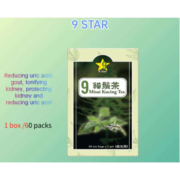(貓鬚茶是 100% 天然的,是可以每天飲用的健康飲品) 成分 貓鬚草、銀針、茶樹 服用方法 將茶包放入杯中,注入 250 毫升開水,等待五分鐘即可飲用。 9星貓鬚茶是透過*馬來西亞規定*的非常好的產品糖尿病人很多東西都要戒口,甜的水果、麵包白飯等都不能吃,好可憐的零食後我都泡2茶袋9星貓鬚茶來喝,這樣我的糖尿就降到正常水平了,而且現在精神也比以前好多了。